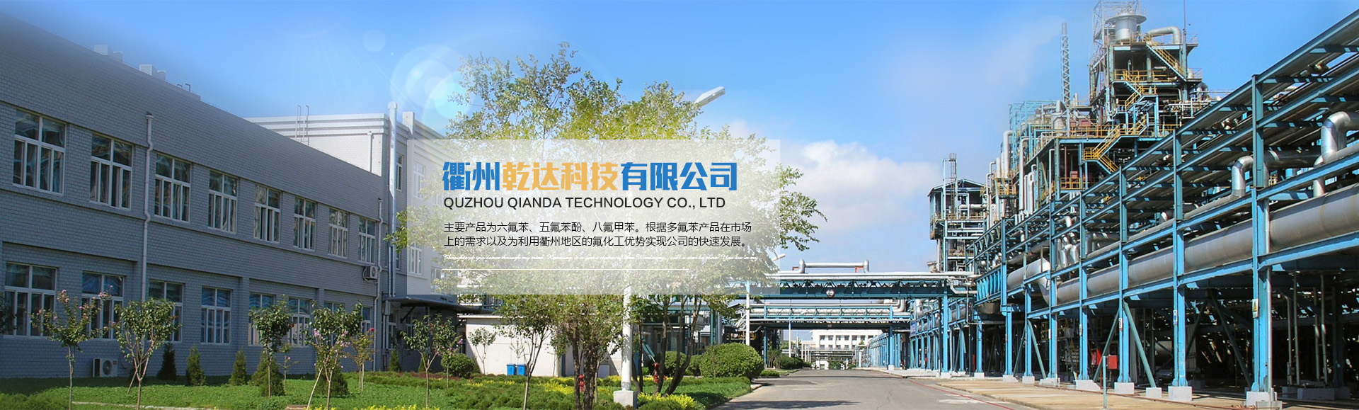 Quzhou Qianda Technology Co., Ltd. is located in 16 Huafeng Road, Kecheng District, High-tech Industrial Park, Quzhou City, Zhejiang Province. Our project adopts advanced manufacturing technique and equipment technology. Main products include hexafluorobenzene, pentafluorophenol, and octafluorotoluene.
